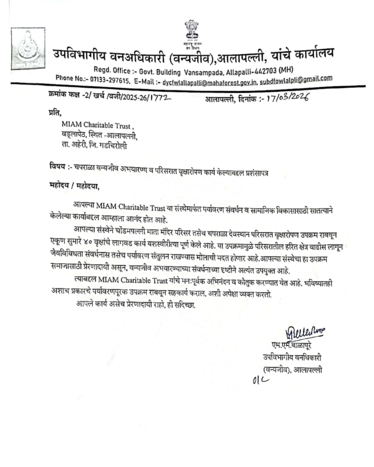 MIAM Charitable Trust has been appreciated for its tree plantation work in the Chaprala Wildlife Sanctuary area.